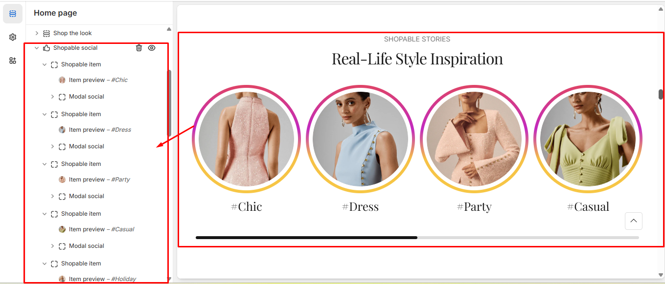 The **Shopable social** section seamlessly integrates product displays onto a banner, enhancing user engagement and simplifying the shopping experience.