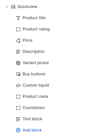 You can choose to add any of the following blocks to display in the quickview popup.