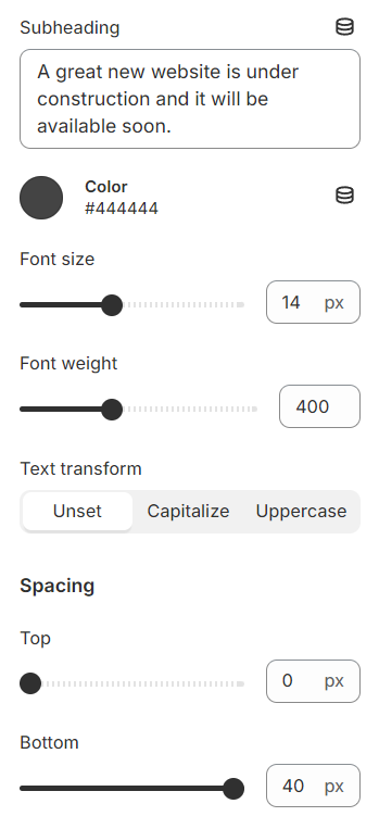 Use the provided text fields to add a suitable subheading. Leave it blank if you do not want to display. Adjust the text color along with the font and transformation.