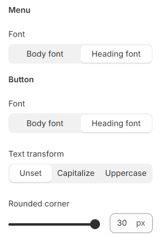 Similarly, the button font can be set to match either the body font or the heading font. Additionally, it includes options for text transformation and setting the radius of rounded corners.